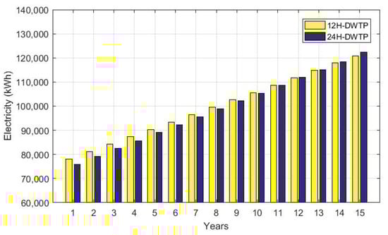 Figure 4 shows the electricity requirements of the configurations, 12H-DWTP and 24H-DWTP, during the project planning horizon. In the first year, the estimated electricity consumption of the 12H-DWTP was 78,134 kWh, while the 24H-DWTP was estimated at 75,897 kWh. In the case of year 15, the energy consumptions of both configurations were estimated at 120,919 kWh and 122,372 kWh, respectively.