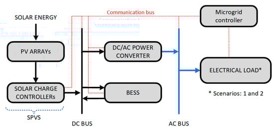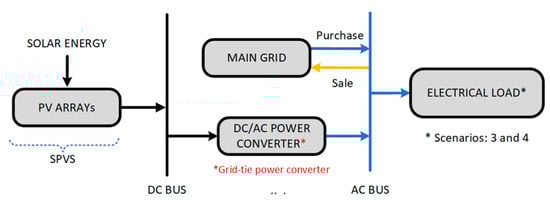 Homer Pro software was the tool used to simulate these scenarios. Figure 5 shows a stand-alone solar PV system consisting of a solar photovoltaic system (SPVS), a BESS, a DC/AC power converter, and solar charge controllers to protect the BESS. Arrays of PV modules comprise an SPVS, and each PV array can have one or several strings of these modules (connected in series/parallel). The input characteristics of the solar charge controller, such as open-circuit voltage and power, restrict these strings. Given this, each PV array must have its respective solar charge controller. Apart from converting DC to AC power and supplying a constant voltage and frequency, the power converter is also responsible for providing or absorbing reactive power in the case of reactive loads [39]. Figure 6 shows a grid-connected solar PV system composed of an SPVS, a DC/AC power converter, and the grid, without considering storage. Both G-SPVS12 and G-SPVS24 worked in a grid-tied mode in the present study [40].