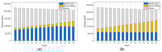 Figure 7 shows how the electricity produced annually by the SPVS in each scenario was distributed to the load (DWTP) and to the BESS, including its excess. Figure 7a shows this distribution for the SPVS12, where the load was completely covered with electricity from the SPVS and BESS, but the average annual excess was 105,688 kWh. Similarly, this average excess was 110,902 kWh for the SPVS24 (Figure 7b). This last figure shows how the BESS required more electricity for its charging process in the SPVS24 than in the SPVS12 because the plant obtained power from this storage system during nighttime hours. However, the plant did not use its pumping systems before 06:00 am and after 5:00 pm in the SPVS12. Given this, the plant made minimal use of its storage system in the SPVS12. Similarly, considering the SPVS24, its BESS required 52,441 kWh of average annual electricity for its charging process, while the SPVS12 required 19,039 kWh. For this reason, the SPVS12’s storage system doubled its lifetime concerning the BESS of SPVS24.