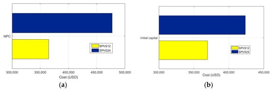 Costs to determine the return on investment of the SPVS12 and SPVS24 scenarios: (a) NPC and (b) initial capital.