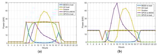 Average hourly power distribution in each scenario among SPVS, BESS, and DWTP in the year 15: (a) SPVS12 and (b) SPVS24.