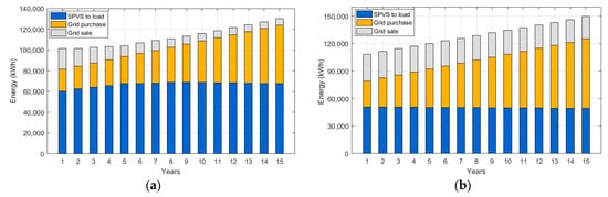 Annual electricity to cover the load in each scenario from the SPVS and the grid, including surplus energy for the sale from the SPVS to the grid, (a) G-SPVS12, and (b) G-SPVS24.