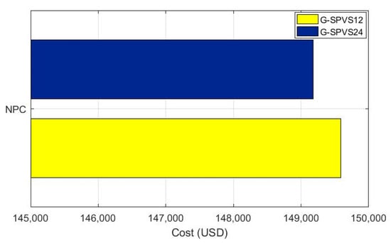 Figure 11 shows the NPC of scenarios 3 and 4 to determine their return on investment. The G-SPVS12 and G-SPVS24 scenarios had NPC values of USD 149,598.79 and USD 149,176.93, respectively. Both scenarios had a similar NPC value, i.e., this was indifferent to the operating time and size of the plant pumping system in each scenario. Similarly, the initial investment for both scenarios was USD 110,577.78 due to their equal size. In addition, the COE was USD 0.158/kWh for the G-SPVS12 and USD 0.159/kWh for the G-SPVS24.