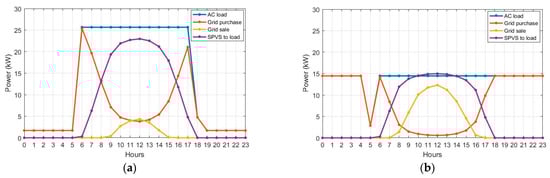 In the scenarios (3 and 4) analyzed in this section, the DWTP as a company has the role of a grid power service user. For this reason, the plant should monitor the levels of solar power penetration to the load and purchase/sell electricity to/from the electric utility company for both scenarios. According to the simulator control logic, the electricity from the SPVS has priority over the grid to feed the load. It should be noted that purchasing electricity from the grid occurs when the SPVS energy does not cover the entire load, so it needs to extract electricity from the grid to complete the remaining load. The sale of electricity happens when the SPVS electricity covers the load, and any surplus is injected into the grid.