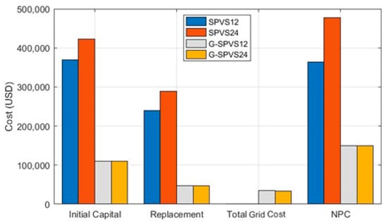 Figure 13 shows the results related to cost analysis (initial capital, replacement, total grid cost, and NPC) for each PV power system. As shown in this figure, the stand-alone scenarios had higher initial capital and replacement costs than the grid-connected scenarios. Among the four configurations, SPVS24 had the highest NPC (USD 477,378), including initial capital (USD 423,363) and replacement costs (USD 289,280), with a COE of USD 0.384/kWh. The high NPC of this scenario resulted from the implementation of the BESS. The BESS represented 54.7% of the NPC, while the SPVS was 22.8%. On the other hand, the NPC of SPVS12 was reduced by 23.6% compared to SPVS24 and obtained a COE of USD 0.384/kWh. In the case of grid-connected systems, the management of the intermittency of the solar resource is their main advantage because the grid acts similarly to the task of the BESS in stand-alone systems [21]. However, these systems must be disconnected from the grid when their power lines present faults (blackouts and emergencies) [40]. Given this, the G-SPVS12 and G-SPVS24 scenarios did not use battery storage systems, which notably reduced their NPC costs. The NPC had a similar value for both scenarios, and, therefore, this cost reached a reduction of about 74% in initial capital costs and 84% in replacement costs for these scenarios compared to the same costs in the SPVS24. In general terms, the G-SPVS24 had the lowest NPC value of all scenarios analyzed, reaching $149,177. The costs of its power converter and SPVS represented 34.2% and 25.3% of the NPC, respectively. The total grid cost reached a value of USD 34,524, representing 22.8% of the NPC and being lower than that of the G-SPVS12.