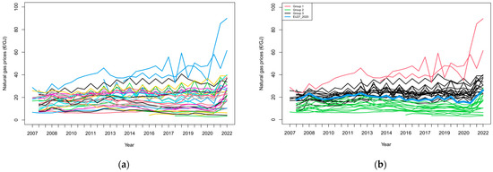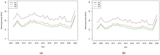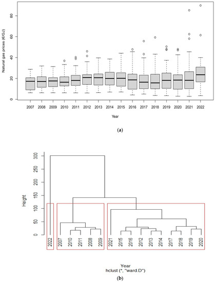 - Three distinct periods of evolution of NG prices can be identified (i.e., 2007–2011 corresponds to a period of price increases, 2012–2021 corresponds to a period of price reductions and 2022 is an outlier year characterized by galloping prices);