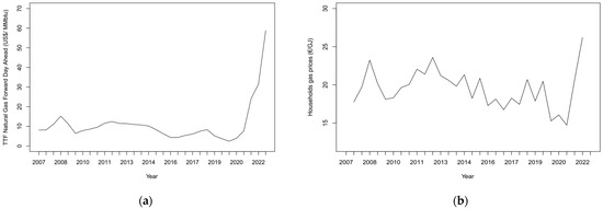 Over the last few decades, natural gas (NG) has been critical to guaranteeing a fully decarbonized economy in agreement with the recent decision by the European Union (EU) about cutting greenhouse gas (GHG) emissions by at least 55% relative to 1990 levels by 2030 [1]. Power, industry and transports are the main sectors that contribute to understanding the importance of NG in terms of an ongoing energy transition since NG can be considered a bridge fuel [2]. After a drastic economic downturn during the COVID-19 pandemic, the market is currently in a state of turmoil that has affected the entire European economy, with a strong impact felt in the cost of living and inflation [3]. The consumption of NG began to rise in the beginning of 2021, accompanied by unprecedented price increases. Along with demand side issues, other factors, such as instability in the European NG markets and uncertainty regarding Russian political actions culminated in the observation of a peak price in the first semester of 2022 [4]. Consequently, EU policy decisions regarding NG infrastructures, supply diversification and renewable energies are currently more necessary than in any other historical period. This study uses information retrieved from the Eurostat database that covers the period 2007–2022 [5] and restricts its focus to the household segment to address four research questions:
