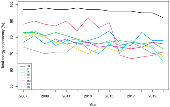 It is convenient to identify the geographical and political scope related to this study, which embraces 34 spatial units belonging to Europe, namely: Austria (AT), Bosnia and Herzegovina (BA), Belgium (BE), Bulgaria (BG), Czechia (CZ), Germany (DE), Denmark (DK), Estonia (EE), Greece (EL), Spain (ES), France (FR), Georgia (GE), Croatia (HR), Hungary (HU), Ireland (IE), Italy (IT), Liechtenstein (LI), Lithuania (LT), Luxembourg (LU), Latvia (LV), Moldova (MD), North Macedonia (MK), The Netherlands (NL), Poland (PL), Portugal (PT), Romania (RO), Serbia (RS), Sweden (SE), Slovenia (SI), Slovakia (SK), Turkey (TR), Ukraine (UA), United Kingdom (UK) and Floating Country Composition (EA). In the floating country composition, data from a specific year always refer to the euro area. In the fixed country composition, the value of all years refers to the same list of countries. Hence, this spatial unit corresponds to the Eurozone. There are two justifications for the final list. First, political actions to tackle NG challenges are negotiated not only by EU institutions, such as the European Commission (EC) and the European Parliament and the Council (EPC), but also by alternative supranational entities such as the North Atlantic Treaty Organization (NATO). Second, both availability and transparency of data hold for all 34 spatial units through the Eurostat database [5]. These jurisdictions depend on natural gas imports from input sources outside their territorial scope and: