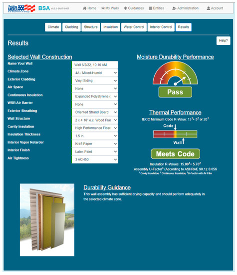 The moisture durability performance is based either on the mold index calculated from the hygrothermal modeling outputs as outlined in ASHRAE Standard 160 or on the consolidated expert opinion [21]. Typically, the entries in the database from hygrothermal simulations specify the material properties of every layer in the wall, and the entries from expert opinion specify only the material properties of select layers. The expert opinion-based entries focus on common issues found in walls that are known to cause long-term moisture durability problems. A more thorough description of how this tool works can be found in the literature [22].