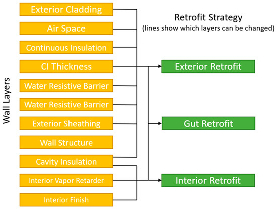 Wall materials that can be changed depending on the type of wall retrofit. CI = Continuous Insulation.