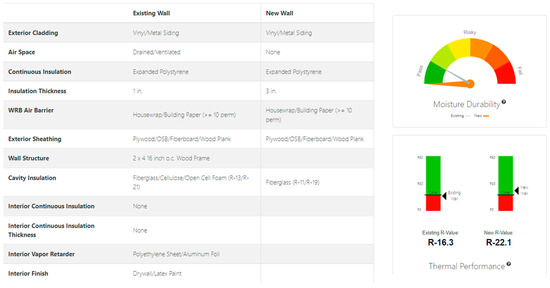 All matches with a mold index of less than two are presented to the user. The matches can be filtered for desired materials, and then one wall can be selected to view its moisture and thermal performance, which can be compared with the existing wall. Figure 3 shows the result screen for the tool, where the existing and retrofit wall materials, moisture durability, and thermal performance are compared.