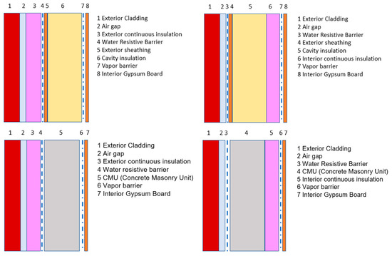 Wall assemblies evaluated in simulations with and without continuous insulation.