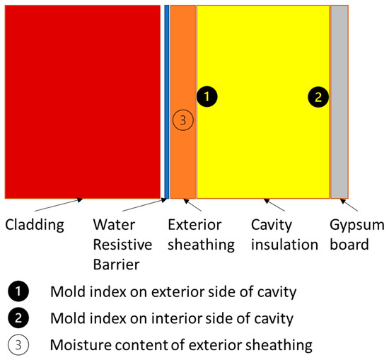 Hygrothermal simulations are post-processed per ASHRAE Standard 160 [21] to consider the maximum acceptable moisture content in a critical layer and the mold growth index in the wall. The exterior sheathing was selected as the critical layer. The mold growth index (MI) was calculated on both the exterior and interior sides of the insulated cavity to account for performance in cold and hot-humid climates. Mold growth in the building assembly was predicted by running a five-year simulation and taking the maximum MI. The MI can range from between 0 and 6 [23].