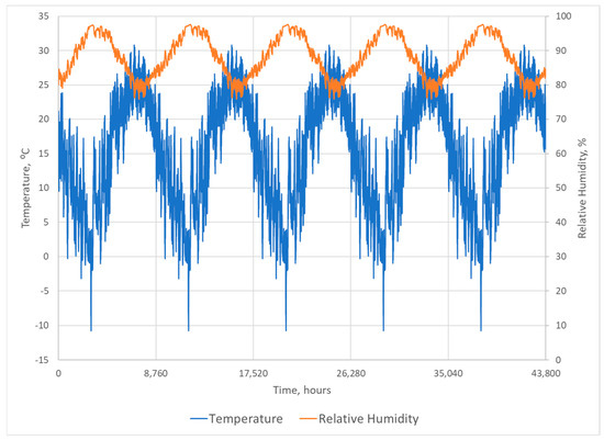 The maximum mold index and moisture content values over the five years were then recorded for each case as the performance value and inputs for ML analyses. Figure 6 shows the hourly temperature and relative humidity on the exterior side of the insulated cavity. Figure 7 shows the post-processed mold index and the average moisture content of the exterior sheathing. The maximum values of the mold index and the moisture content over the simulated period are selected as the final values. The mold index is calculated both for the exterior and the interior side of the insulated wall cavity. The highest mold index of the two is selected as the final performance value.