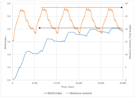 Mold index on the exterior side of the insulated cavity in an example wall based on hourly temperature, relative humidity, and the average moisture content of the exterior sheathing. Arrows are pointing to the maximum value over the period.