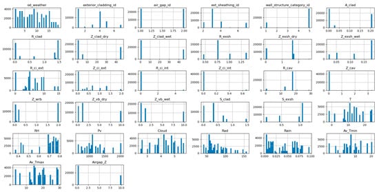 Figure 8 shows the histogram of different input features used for the ML model to predict the mold index. Most weather inputs are widely scattered between the minimum and the maximum values. Some of the inputs are concentrated on several values, such as the vapor resistance of the vapor barrier (Z_vb_wet) and the thermal resistance of the continuous insulation on the interior side of the wall (R_ci_int). The histograms help identify which inputs would require refinements to improve the ML predictions. Ideally, we would want the distribution of values to be evenly scattered across the range of the property values.