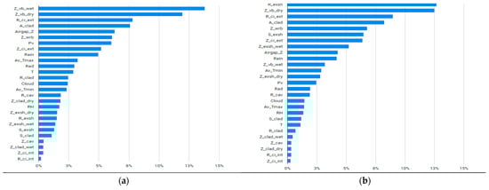 The features in the input data are shown in the order of importance in Figure 9 as determined by the ML tool. The definitions of the parameters are listed in Table 5. The most important features in determining the mold index in the walls are the water vapor resistance (1/permeance) of the vapor barrier (Z_vb_wet and Z_vb_dry) and the thermal resistance of the continuous insulation (R_ci_ext), which are in the top three for predicting the maximum moisture content. However, the thermal resistance of the exterior sheathing is now the most important feature for determining maximum moisture content. Otherwise, the features are in a similar order for the mold index and maximum moisture content predictions, with slight changes in the order of importance.