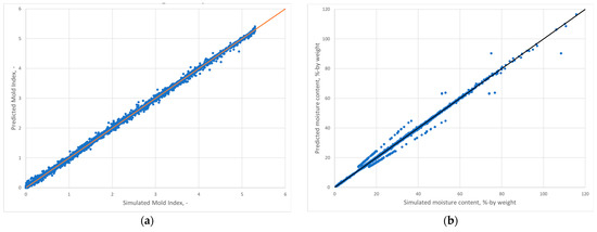 Predicted results from ML models vs. simulated values from hygrothermal simulation tools for (a) the mold index and (b) the maximum moisture content. Charts include all input data in the training set. The line indicates the perfect fit.