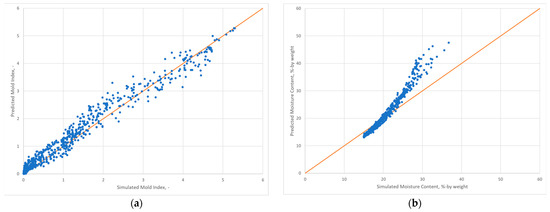The predicted values from ML models for the mold index and moisture content are depicted vs. the simulated values from hygrothermal simulation tools in Figure 10a,b, respectively. In contrast to the mold index, the moisture content has sections where some of the simulated and predicted values diverge at moisture contents greater than 15%. Despite the divergence, the correlation seems strong, as reflected by R2 values of 0.997 and 0.995, respectively.