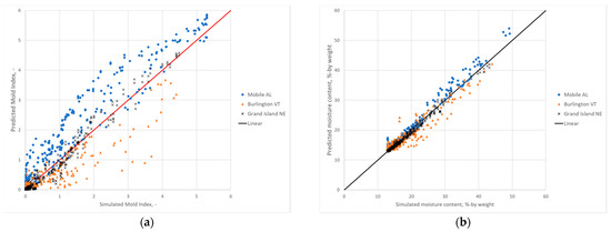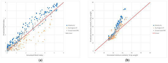 Predicted vs. simulated mold index and maximum moisture content for new climates (i.e., Mobile, AL, Burlington, VT, Grand Island, NE) with existing materials in training. (a) Mold index prediction. (b) Maximum moisture content prediction. The line indicates perfect fit.