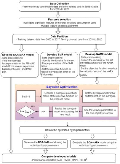 Therefore, this study mainly focuses on forecasting the total electricity consumption using statistical and ML algorithms, namely ARIMAX, SVR, and NARX. Besides employing Bayesian optimization, a successive design technique for the global optimization of black-box functions without derivatives, this work introduces automated hyperparameter tuning for the suggested ML models [11]. By building a probability model based on the best evaluation from numerous iterations’ outcomes, Bayesian optimization finds the value of the hyperparameters that minimize an objective function. Furthermore, this optimization approach validates the model’s error using a set of hyperparameters and seeks to choose the hyperparameters with the lowest error on the validation set. Bayesian optimization is the most frequently used optimization technique due to its worthwhile benefit of using the acquisition function to determine where to sample, making it more distinguishable from other used optimization techniques, such as manual search, grid search, and random search [12].