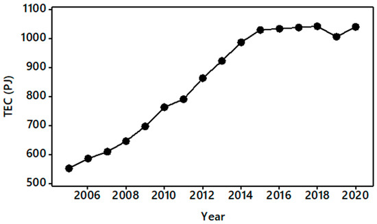 Yearly TEC data of the Kingdom of Saudi Arabia from 2005 to 2020 was used in this study. Initially, five features, namely, GDP, population, production of refined products, imports, and exports, were considered. All the data were collected from the Saudi Central Bank from 2005 to 2020 [22]. The time series plot of the yearly EC (PJ) from 2005 to 2020 indicates an overall increasing trend (see Figure 2).