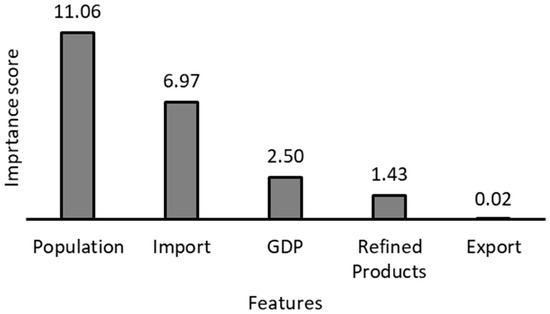 The yearly datasets for TEC from 2005 to 2017 were mainly used to train the models, and data from 2018 to 2020 were used to investigate forecasting errors and to avoid overfitting. The original dataset involves five features: population, GDP, import, export, and total refined products. However, the initial feature set may consist of redundant data, which can increase the computation costs and affect insufficient forecasting accuracy [49,50]. To select the most significant features of TEC, several feature selection techniques were used, namely, the Pearson correlation coefficient, univariate feature ranking for regression using F-tests, rank importance of predictors using the RReliefF algorithm, sequential feature selection, and neighborhood component analysis. Based on the results of correlation analysis, population, GDP, total refined products, and imports are strongly associated with TEC (all p-value < 0.001), while export is not (p-value = 0.754, 0.05) (see Table 3). The results of other feature selection algorithms also indicate that export is not an important feature. The overall ranking of the features is presented in Figure 3. Thus, the four features (population, imports, GDP, and refined oil products) are considered in this study to construct the forecast models. Data were standardized as part of data pre-processing.