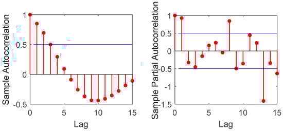 where represents the AR parameters, and represents the MA parameters. Moreover, is the regression error, denotes a zero average and the time series error term, G is the backshift operator coefficient, is the observed value at time shows the lag degree, and is the output. The autocorrelation function (ACF) and the partial autocorrelation function (PACF) can be used to select the value of p and q. The ACF and PACF can be beneficial to fit autoregressive models and detect periodicities and outliers [12,34].
