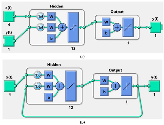 Here, represents the exogenous time series, represents the response time series, is the input delay (delay of the exogenous time series), m is the feedback delay (delay of the response variable), and the nonlinear function is represented by . The NARX neural network model had two types of architectures, namely, open loop and closed loop, that executed parallelly, as shown in Equations (4) and (5) [39]: