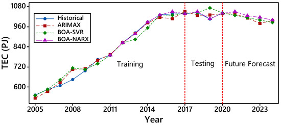 To analyze the generalizability, the study calculated the future forecasted value for the next four years (2021–2024) using the features generated by the SPSS modeler. Figure 8 demonstrates the four years of future TEC forecasts for all three models. The future forecasting for all three models has a similar trend, and the values are very close to each other, suggesting that the developed models are comparable. Furthermore, due to the latest updated data for TEC in Saudi Arabia that was released in 2021 [48], this study has compared the original value for TEC with the predicted values for 2021 (shown in Table 8). The results indicate a good forecasting ability for all three developed models, while the BOA–NARX performed the best.