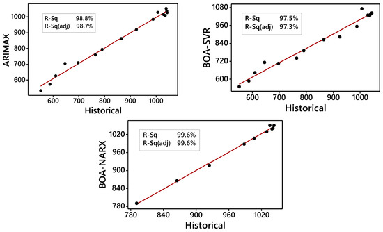 Fitted line plot of the historical data with corresponding forecasted values of ARIMAX, BOA–SVR, and BOA–NARX. Here, R-Sq and R-Sq (adj) represent the coefficient of determination and the adjusted coefficient of determination, respectively.