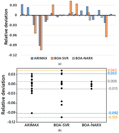 The relative deviations of the forecasted TEC for the developed models from the historical data were calculated. As shown in the clustered column chart Figure 10a, relative deviations in most of the year for all models are scattered around the zero line. It can also be observed from Figure 10b that the range for relative deviation for BOA–SVR (−0.105, 0.043) from the historical data is higher than that of the ARIMAX (−0.092, 0.033) and BOA–NARX (−0.015, 0.008) models, and the lowest deviation was found in the BOA–NARX model.