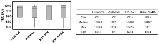 However, in contrast with the introduced articles, this study included two super learner ML approaches (BOA–SVR, and BOA–NARX) to forecast TEC and compared their performances with the widely used statistical approach (ARIMAX). Furthermore, as previously stated, the proposed models had four features, and the feature of refined oil products was not incorporated as an exogeneous variable to forecast TEC in any previous studies. Eventually, this study applied BOA to select the optimum hyperparameters that enhanced the prediction performance.