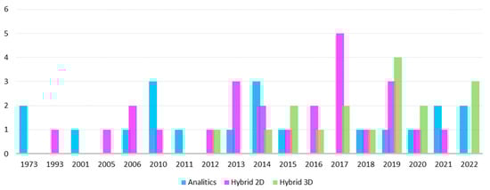 We have analyzed works published in the years 1973–2022 (Figure 1). It should be noted that the authors use three main methods of analysis: analytical, hybrid using two-dimensional FEM models, and hybrid using three-dimensional FEM models. The use of individual methods in the relevant years was undoubtedly closely related to the then-current state of tools available for the computer analysis of electrical machines. The structure of this work is divided based on the type of methods used by the authors. Section 2 presents publications that used only analytical methods for vibroacoustic analysis. Section 3 summarizes works in which the authors used hybrid methods based on both analytical models and two-dimensional models for FEM analysis. Section 4 discusses and analyzes works in which the basis of the analysis was the use of hybrid two- and three-dimensional models. Section 5 discusses and summarizes the entire scope of the literature review, highlighting and listing the most important factors influencing the noise of traction electric motors. These factors are presented in a synthetic way in the form of a table.