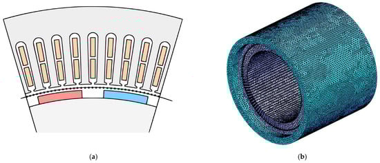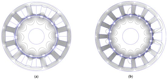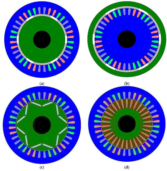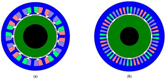 In [53], permanent magnet synchronous motors with concentrated windings (Figure 6a) and surface permanent magnets (SPM) were analyzed. The analysis was focused on the ratio of the number of stator slots to the number of poles, while also not omitting the so-called asymmetric motors (e.g., those with 14 poles and 15 stator slots) (Figure 6a).