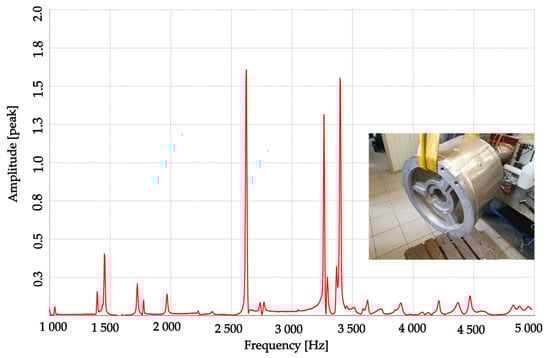- an experimental method using a hammer with which the motor housing is struck, and exemplary results of such an experiment are shown in Figure 3 (spectral analysis of the sound generated by the housing allows to identify its natural frequencies);