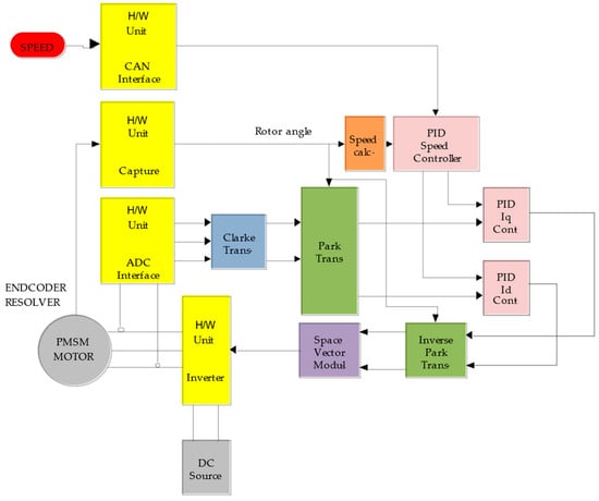 The proper determination of the rotor position of a PMSM motor has a very large impact on its traction performance. This is particularly important in the multi-pole motors used in electric vehicle drives. In [43], the effect of the error in the determination of the rotor position, based on the resolver signal, on the electromagnetic noise generated in the motor was evaluated. To this end, a theoretical analysis of the effect of the rotor position error on the harmonics of the supply current was first carried out. Then, the spatial distributions and temporal characteristics of the electromagnetic force were analyzed. The results showed that the rotor position error introduces additional sideband harmonics to both the current and electromagnetic force. The simulations and tests performed confirmed the results obtained during the process of the theoretical analysis. The results presented in the article can be used at the stage of the laboratory testing of a PMSM motor to assess the correctness of the rotor position determination in a drive system using the field-oriented control (FOC) algorithm (Figure 4) [44].
