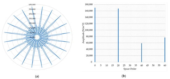 The authors of [56] used a classical hybrid method to analyze the noise of a permanent magnet synchronous motor mounted on the rotor surface (Figure 7b). The motor they analyzed was a 2p = 44 poles machine, so the thickness of the stator yoke was relatively small in relation to the diameter of the stator. Multipole motors do not require a thick stator yoke for magnetic reasons, but a thicker stator yoke is often required for mechanical reasons and to reduce motor noise. First, calculations of the main harmonics of the magnetic field and the forces acting in the motor’s air gap were carried out using an analytical method. Based on the above calculations, it was found that the deformation of the stator core, which is directly responsible for the noise generated by the motor, is inversely proportional to four times the square of the order of the force. For this reason, those electromagnetic forces that had a spatial order greater than 4 were omitted from the analysis. Further calculations to investigate the sources of motor noise were performed in the Ansys environment, extending the analytical calculations and investigating the effect of electromagnetic forces up to the fourth order. The final conclusions of the study, for the analyzed motor, are that two of the main sources of noise are the zero and fourth space order electromagnetic forces.