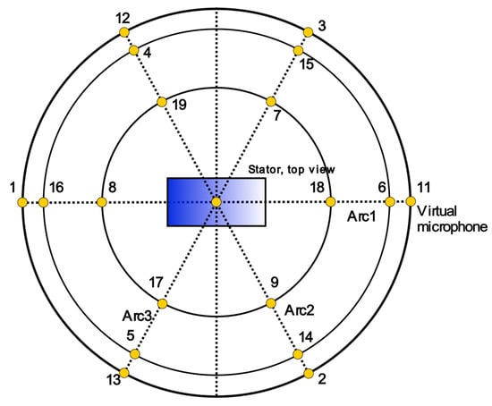 Ref. [83] presented a comprehensive noise analysis of an IPM motor with permanent magnets and distributed winding. The maximum power of the motor is 100 kW, the maximum speed is 12,000 rpm, the number of magnetic poles is 2p = 8, and the number of stator slots is Qs = 48. In this paper, note that nodal electromagnetic forces were needed as input for the vibroacoustic simulations, 3D mesh structure of the motor, and modal properties: the natural frequency, vibration waveform, and modal damping factors. The mass and stiffness of the motor structure are of key importance for the accuracy of the simulations. The housing and endcap were somewhat simplified for the purposes of simulation, but their main dimensions were retained, so that the weight does not differ from the real motor. Particular attention was paid to the analysis of the influence of the two-segment skew in the rotor on the amplitudes of the dominant harmonics of radial force densities, and attempts were made to reduce noise by the appropriate selection of the skew angle. The final results showed that the two-segment skew of the magnets helps to reduce the magnitude of the dominant harmonics of the radial force densities of the stator, especially between 3000 and 6000 rpm. It was simulated that the highest SPL (sound pressure level) [61] occurs in the same plane in which radial vibrations and acoustic pressure arise, i.e., in the transverse plane of the motor (Arc.1)—virtual microphones 1, 6, 8, 11, 16, and 18 in Figure 9.