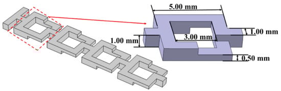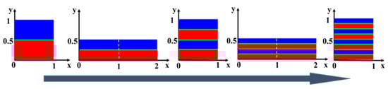 Investigations on the flow behavior and mixing process in a wide variety of microchannels play a crucial role in the new or popular design for the passive micromixer of liquid-liquid. From open literature, Wang et al. (2007) have reported that the mixing efficiency in the diffusion channel of the passive micromixer of liquid-liquid with barriers is much greater than that without the barriers [38]. In this paper, a chaotic flow pipeline is constructed using the Baker constant-area chaotic map principle since the fluids mainly rely on molecular diffusion to mix in the laminar flow state, and the mixed fluids are generally incompressible, as shown in Figure 1. By selecting a = b = 0.5 in this figure, the chaotic Baker map shown in Figure 2 can be obtained. Blue and red represent different fluid cross-sections, while green represents the contact line between the two fluids, which reaches more layers as the fluid is compressed, stretched, cut, and stacked (the length of the green line increases gradually). The increase in the length of contact lines between different fluids means that it is easier and easier to mix depending on molecular diffusion. Based on the chaotic mixing theory, Baker-mixer was constructed according to Baker’s transformation to deeply understand the mechanism of chaotic mixing (see Figure 2). Baker-mixer has two samplings, and detection intakes with inlet and outlet sizes of 1.00 mm × 1.00 mm, and pipeline sizes are the same as in Ref. [40] for comparison. A mixing unit is defined as a basic mixing unit that periodically splits and merges. The Baker mixer has a single shunt combined structure with a mixer length of 7.00 mm. It should be noted that the pipeline of the mixing unit of the Baker mixer is reduced to half (0.50 mm) of the original pipeline (1.00 mm) in some places, and it is composed of four basic units, as shown in Figure 3.