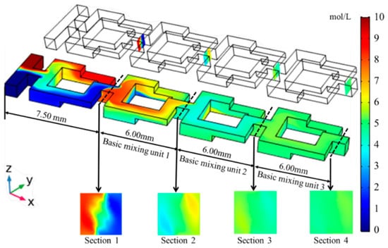 The fast development of microreactors has attracted the attention of many countries all over the world [5]. Micromixers can provide a much larger interfacial area that increases the rate of transport processes and, in turn, results in lower residence time [6]. Diffusive transport in micro-devices is faster than in conventional mixers in relation to the time scale of chemical kinetics. It has already been proved that reacting performance can be enhanced by using micro reaction technology significantly due to the nice mass and heat transport performances of the microreactors [7,8]. Therefore, two-phase flow in microsystems finds a great wide application in the chemical and biochemical industries, e.g., for extraction, aromatic nitration, emulsification, and separation [9]. Mixing fluids in passive micromixers is a very challenging task because advection is usually the dominant force in the pipelines of the micromixer. Strictly laminar fluid flow that is usually Reynolds number less than 100 and very low molecular diffusion coefficients (e.g., typically in the range from 10−9 m2/s to × 10−11 m2/s) fundamentally create tough mixing conditions [10]. These difficulties are usually achieved through special micromixer designs to generate chaotic fluid motion, usually at Reynolds numbers from 10 to 20. As a result, the contact surface between the fluids increases, which in turn accelerates diffusion mixing. Typical design and fluid mixing examples may be seen in Refs. [11,12,13]. It is generally accepted that it is necessary to develop multiple types of microreactors since micromixing performance is a critical feature in the development of microreactors.