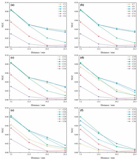 Trend chart of NUC value of each section with the increase of mixing path length under thirty-six working conditions. (a) working conditions C1–C6; (b) working conditions C7–C12; (c) working conditions C13–C18; (d) working conditions C19–C24; (e) working conditions C25–C30; (f) working conditions C31–C36.