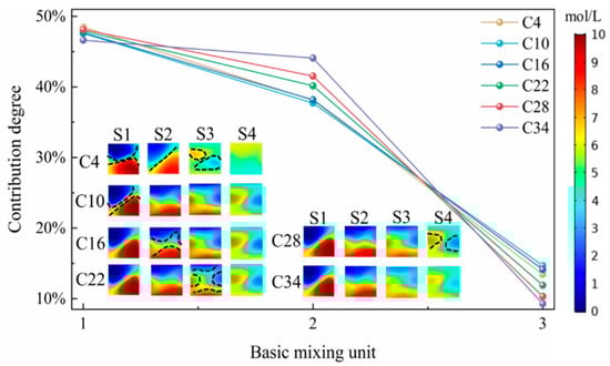 Contribution degree of basic mixing unit to mixing under working conditions C4, C10, C16, C22, C28 and C34 and sectional concentration distribution nephogram under corresponding working conditions.