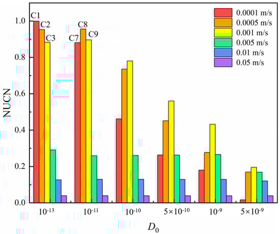 It is worth mentioning that the diffusion coefficient is not correlated with the initial velocity. In fact, the diffusion coefficient of a molecule has been used to measure the diffusion ability between molecules of different substances and is one of the physical properties of a substance. It is well known from Fick’s law that the physical meaning of the diffusion coefficient is the amount of the mass of the substance diffused through the unit area per unit of time: the larger the diffusion coefficient, the more mass of the substance diffused through the unit area per unit time, and vice versa, the less. In this paper, Fick’s first law is observed in the simulation, and the diffusion coefficient is a constant that is related to the temperature, the viscosity of the fluid and the size of the molecules. Therefore, the diffusion coefficient and the initial velocity can exist as two independent variables to a certain extent. In order to compare the effect of initial velocity on the mixing efficiency of the chaotic Baker pipeline, numerical simulation was carried out for working conditions from C1 to C34 at different initial velocities, as shown in Table 1. As can be seen in Figure 10a, the broken line corresponds to the diffusion coefficient D0 = 5 × 10−9 m2/s, and the value of NUCN at a lower level throughout with the increase of initial velocity (<0.39800). It can be seen from Figure 10a that the mixing effect of the chaotic Baker pipeline increases with the increase of initial velocity according to the broken line corresponding to the diffusion coefficient D0 = 1 × 10−13 m2/s. The reason for this phenomenon is that when the diffusion coefficient is too small, convective mixing always dominates in the process of fluid mixing. With the increase of initial velocity, convective mixing intensifies, which further promotes the mixing effect of convective mixing on different liquids.