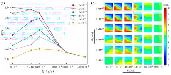 The influence of inlet velocity on mixing effect: (a) NUCN value corresponding to the concentration distribution nephogram of the outlet section of chaotic Baker mixer; (b) nephogram of concentration distribution at the outlet section of chaotic Baker mixer under thirty-six working conditions.