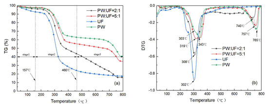 For UF resin pellets, the first stage is the water evaporation and free formaldehyde release stage [20]. Similar to PW, weight loss is slow at this stage. The second stage (66% weight loss) is the devolatilization stage, which is mainly due to the weight loss caused by the breaking of a large number of chemical bonds. The hydroxymethyl group is split to form formaldehyde, the C-N bond is broken and volatile substances are generated [21]. The TG curve presents that the thermal stability of UF resin is lower than that of PW, and the maximum weight loss peak (302 °C) is reached at a lower temperature, mainly because the thermal stability of UF resin is worse than that of PW. The third stage is mainly the decomposition process of the pyrolysis residue. The mass is almost unchanged, and the structure of the residual material tends to be stable.