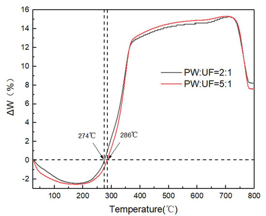 ΔW was introduced to evaluate the synergistic effect of UF resin and PW co-pyrolysis, which represented the deviation of the theoretical values from the experimental ones. The formula was as follows [17]: