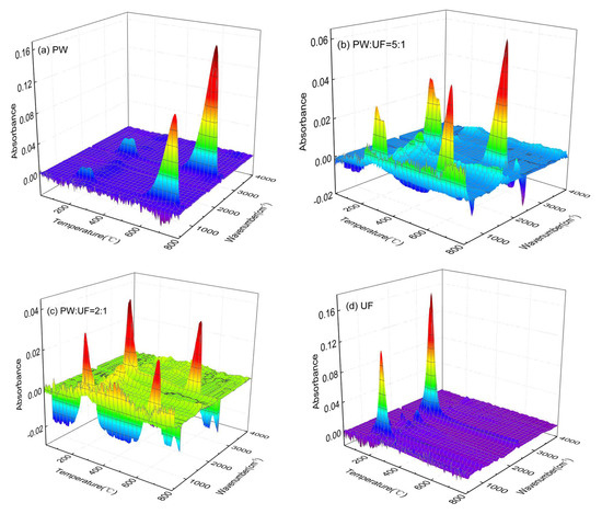 Figure 3 shows the three-dimensional infrared spectra of pyrolytic gases of four samples detected by FTIR in nitrogen atmosphere. Through the wavenumber and intensity of the absorption band in the three-dimensional infrared spectrum, the variation trend of the gas species and the amount released during the pyrolysis process with the pyrolysis temperature can be qualitatively analyzed. The infrared characteristic absorption wave number (unity: cm−1) is the most obvious at 669 and 2358 cm−1, indicating that CO2 is a major product of sample pyrolysis. At the same time, it can be seen that the temperature range of pyrolysis gas released from the PW pellets is mainly concentrated in 200~350 °C and 600~750 °C. The pyrolysis gas release of the UF resin pellet is mainly concentrated at 180~350 °C. for the mixed pellet, and the results are more complicated due to the interaction between UF resin and PW during the pyrolysis process.