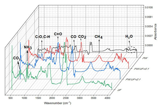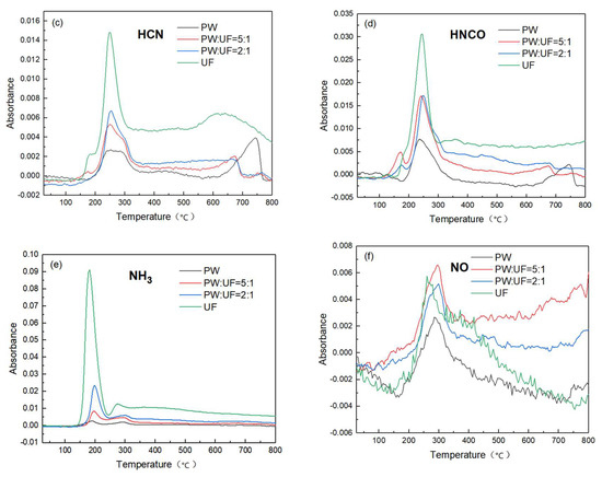 In addition, it can also be observed that the effects of UF resin on the pyrolysis gas composition are mainly reflected in the nitrogen-containing compounds during pyrolysis. The nitrogen content of PW is very low, and the production trend of HCN, HNCO and NH3 is similar to that of UF resin, and the maximum absorption peaks of HCN, HNCO and NH3 are significantly increased compared with PW. The temperature required for the second absorption peak of CO2 decreases dramatically, mainly due to UF resin promoting the decomposition of solid-phase coking in PW. With the addition of UF resin, the production trend of NO increased greatly, which is much higher than that of UF resin and PW pyrolysis alone; it is possible that the co-pyrolysis of UF resin and PW promotes the further decomposition of the organic oxygen-containing structure, which improves the release of NO.