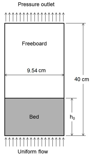 The 2D simulations on a center plane of the cylindrical reactor are performed and a cartesian coordinate system is employed. An illustration of the 2D center plane used in the simulation is presented in Figure 1. The use of a 2D approach for the bubbling fluidization regime, where velocity is less than 4 times of , is validated by several studies [8,11,14]. To define boundary conditions at the inlet and outlet of the reactor, a uniform inlet velocity and atmospheric pressure are defined, respectively, and to model gas–wall interactions, the no-slip boundary condition is considered. The coefficient of restitution is considered to be 0.9 and the Gidaspow-blend drag model is employed based on similar studies. Deza et al. [5] executed an intensive grid study resolution, where the rectangular domain is discretized uniformly. It was found that 38 by 80 mesh along with x and y axis, respectively, yielded accurate results that were not computationally expensive.